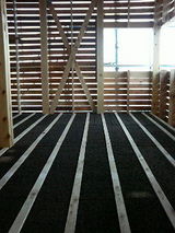 炭化コルクを使った床の断熱工事が完了し、床をはる工事をしているところ。
