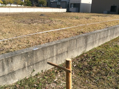 地盤改良に先駆けて、隣の敷地をお借りして水糸を張りました。